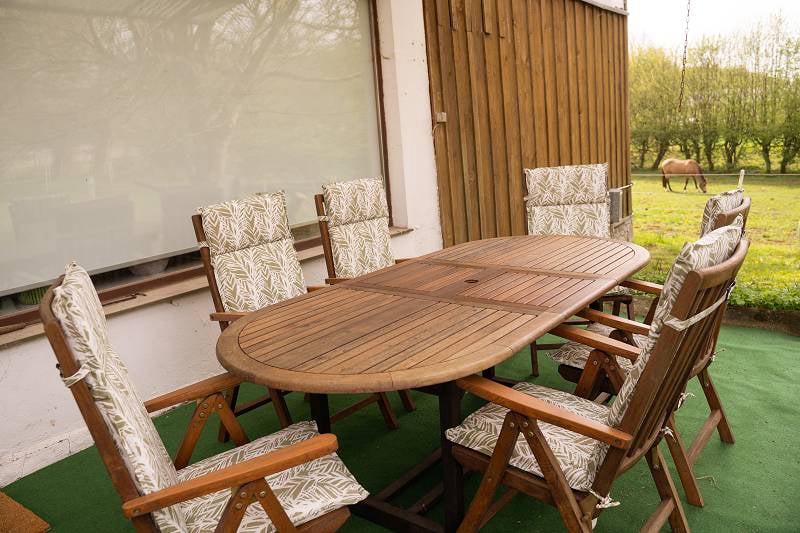Mit GartenstĂŒhlen und Tisch â der perfekte Ort zum Verweilen. Ein Grill steht bereit, damit ihr laue Abende beim Essen genieĂen könnt.
