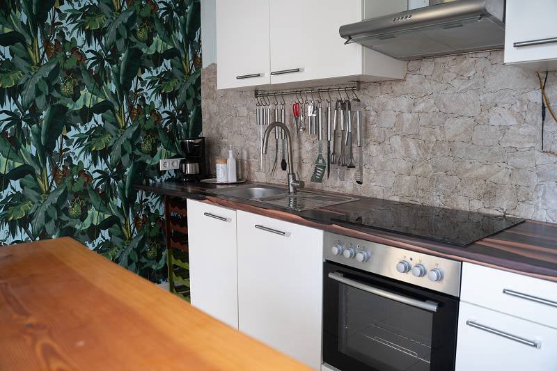 Die KĂŒche bietet alles, was ihr brauchst, Töpfe, Pfannen, RĂŒhrschĂŒsseln, Teller, GlĂ€ser, Besteck, Kochutensilien, Toaster, Herd, KĂŒhlschrank, SpĂŒlmaschine und vieles mehr.